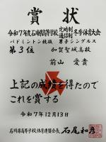 公式大会で初めて勝った選手、ダブルスで勝った選手、フルセットまでもつれて残念ながら勝てなかった選手などさまざまですが、4年次生の前山愛貴さんが、第3位に入賞し、有終の美を飾ることができました。