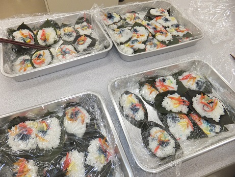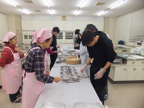 柿の葉寿司作り体験! 投稿日時 : 2017/12/14 3年次担任(商) 大聖寺食生活改善指導員の方たちをお招きして、柿の葉寿司作りを体験しました。最初は、作業におぼつかなかった生徒たちも、時間が経つにつれ、柿の葉の上に寿司飯や具材をきれいにのせられるようになっていました。できあがった柿の葉寿司は、先日の授業で絵付けした各自の皿に盛り付けられて、同じく絵付けした湯呑みのお茶とともに、みんなでおいしくいただきました。 Tweet