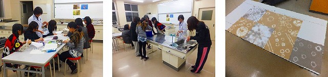 11月12日(月)、家庭科の研究授業でした。研究テーマは、学習意欲を高めるための授業の工夫です。2年生が椎の実で布を染めます。この椎の実は、先日から福村先生が近くの江沼神社で拾い集めてきたものです。生徒が登校する頃は真っ暗で椎の実を見つけることができないので、日中に先生が集めてきたのでした。絞り染めや板締めの方法を学び、できあがりのイメージをして、布全体に模様を入れていきました。生徒は手際よく作業をしていました。