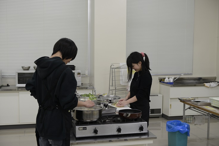 「夜桜ハイク」から戻り、生徒会役員進行の下、「対面式」です。在校生が新入生に歓迎の言葉を述べたのに続き、新入生が自己紹介を行い、会場は温かい拍手に包まれました。そして生徒会役員が午後3時から準備・調理した豚汁とお花見弁当を囲んでの「食事会」。先輩から新入生一人ひとりに手尺でお茶のサービスもありました。その後、今年一年間みんなで支え合うことを誓いながら、楽しく団らんしました。