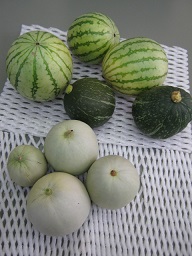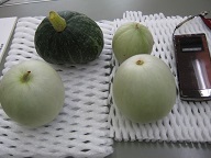 ミニカボチャが獲り頃になりました。ついでに葉の枯れたメロンもとりました。