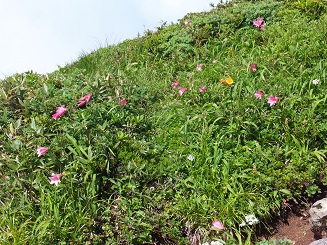 雪渓を上りつめたところには・・・・・ シラネアオイ、マツムシソウ、チシマギキョウ などなど 飯豊を満喫しました。