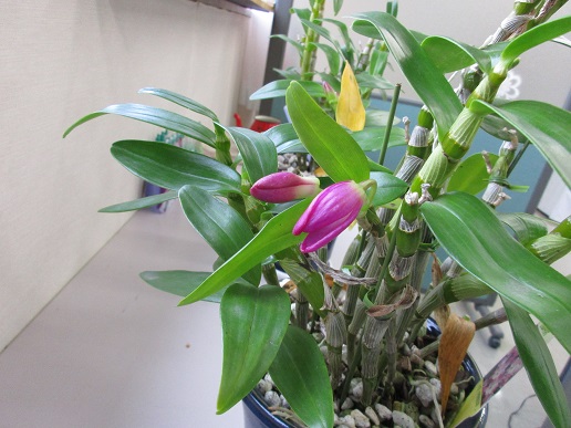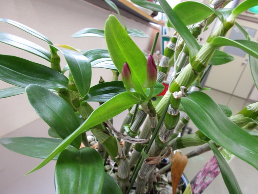 室内のデンドロ(昨年購入)が無事夏を越して花芽が付き、色が少し出てきました。