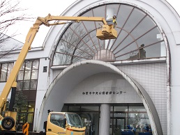 やすかがでは今日は恒例の窓拭きです。クレーンで高い窓も綺麗にしてくれますね。