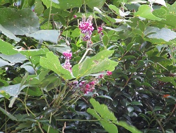 公園ではアケビが旬をむかえていますよ。鳥が見つけてつついていますが、私の子どもの頃は甘いおやつでしたね。