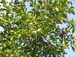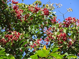 青空にゴンズイの赤い実が映えます。プランターではカボチャが咲きましたので受粉してみました。実がなるかな?