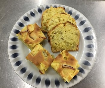 右のパウンドケーキは、チーズとサツマイモを5mm角に細かく切って混ぜたもので、チーズの塩味もちょっと効いたあっさり味のケーキとなりました。