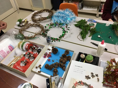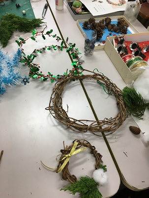 サツマイモの蔓で作ったリースを乾燥させて、飾りつけに取り組んできました。