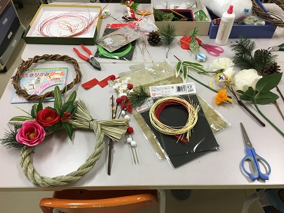 教室では、今度はお正月飾りの制作に取り掛かっています。市販のわらで作ったリースのほかに、アケビや木香バラのツルでリースを作ってみました。