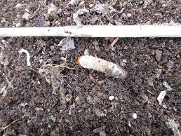 オクラにアリがのぼってかじっているようです。また、夏野菜のプランターを掃除していたら幼虫が出てきました。あわてて土の中に潜っていきましたが昆虫も必死に命を繋いでいますね。