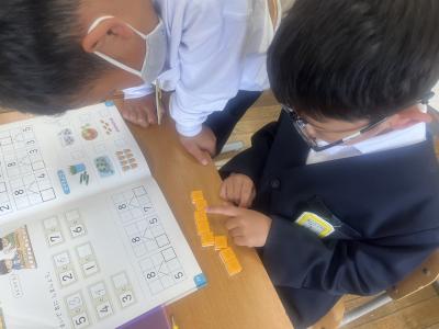 ブロックを数えて、離して・・・の作業も慣れてきています。 ペアで一緒に確かめている姿もありました。「どう?」「 あっとる?」「兄弟おる!(3と5、5と3)」「ここやよ〜」 と、活発な関わり合いが生まれていました。