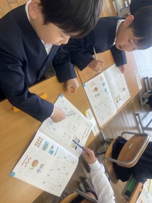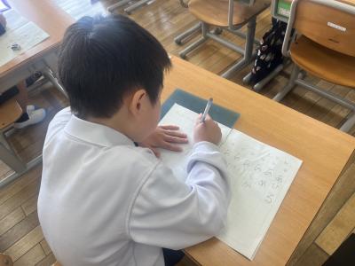 ノートの書き方を学び、「あ」からはじまる言葉を探しました。 1人でじっくりノートに言葉を書き溜めている子、 ロッカーの名前を見て、「あ」 からはじまる友だちの名前を見つけている子、 友だちと言葉を出し合ったり、 言葉の書き方を確かめたりしている子、 さまざまな学びの姿がありました。