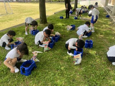 きっと、夏休みに入る前には、 きれいな花を咲かせてくれることと思います。あさがおと1年生。これから一緒に大きくなあれ。
