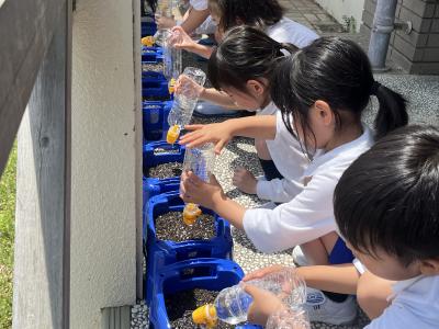 種を土の中に入れ、土をやさしくかぶせ、「大きくなるんだよ〜」 「がんばれ〜」と愛情いっぱいお水をかけました。