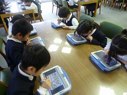 2年算数 <時計の読み方の復習> 投稿日時 : 2014/03/13 教職員 カテゴリ:2年生 2年算数 <時計の読み方の復習> 本日5限目は、2-1で時計の読み方の復習をしました。 教室の大型テレビでフラッシュカードを使って時計の読み方の復習をしてから、学習探険ナビ「ワンタのよていひょう1」の使い方を学び、タブレットPCが準備してある図書室に移動。 各自がタブレットPCを使い、「ワンタのよていひょう1、2」で時計の読み方を学習しました。 使用機器:大型テレビ、パソコン、書画カメラ、タブレットPC 使用教材:学習探険ナビ Tweet