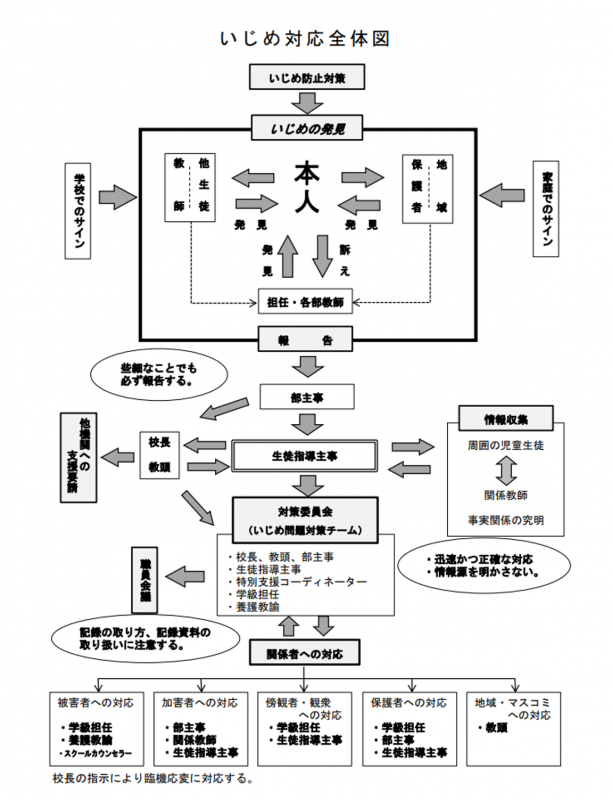 ・ いじめが確認された場合は、いじめた児童・生徒の指導とその保護者への助言を継続的に行うとともに、必要に応じて外部専門家等の協力を得て、学校として組織的に再発防止措置をとります。