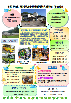本校は昭和50年4月に肢体不自由障害の子どもたちを対象として創立された学校です。児童生徒一人一人に応じた個別の教育支援計画・個別の指導計画を作成し、福祉・医療・労働等 の諸機関と連携しながら、教育活動を進めています。今年度の児童生徒数 は、小学部8名、中学部5名、高等部4名、合計17名(うち、通学生は 13名、小松こども医療福祉センター内の小松療育園生4名 令和7年4月1日現在)です。