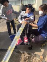目標の場所を目掛けて、雨どいのスロープの上を種芋が転がっていく様子を観察しました。