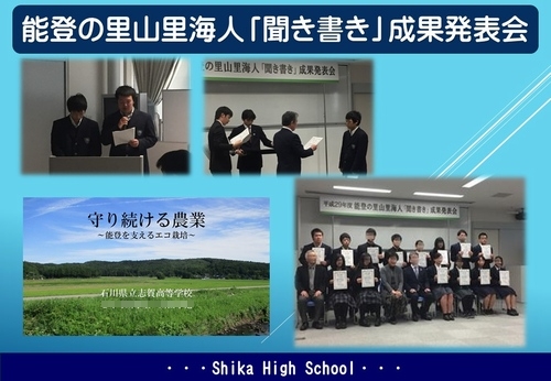 3月4日日曜日、能登空港ターミナルビル4階にて、平成29年度能登の里山里海人「聞き書き」成果発表会がありました。能登地区7つの高校の発表があり、本校からは「守り続ける農業~能登を支えるエコ栽培~」というタイトルで直海・釈迦堂営農組合を立ち上げ多角化経営で活躍されている岡野秀彰さんからお聞きした内容をまとめて発表しました。