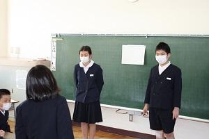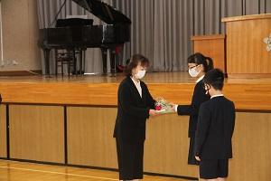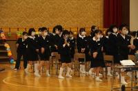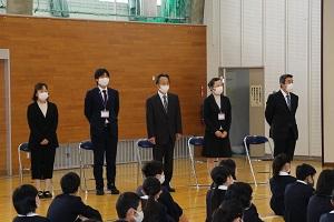 卒業式と同様,別れを惜しむさみしい心の内を表すかのような空模様の中,離任式が執り行われました。今年度は5名の先生方とお別れすることになりました。これまでたくさんお世話になった先生方とのお別れは悲しいものですが,お互いに活躍できることを期待して,お見送りしました。