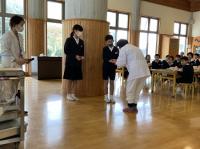 5年生の調理実習第2弾。今回はみそ汁でしたが,出汁づくりから勉強し,昆布,煮干し,鰹節,給食の出汁,粉末出汁の5種類を飲み比べ,自分が一番おいしいと思った出汁でそれぞれみそ汁をつくりました。この経験を生かし,お家でもつくってみてほしいと思います。なお実習は,出汁は栄養教諭管理の元,全員分の出汁を小分けにし,子ども達は自分のポリ袋に材料を入れてつくる,個別形式で行いました。