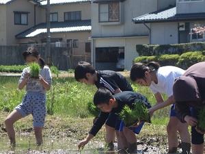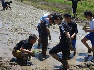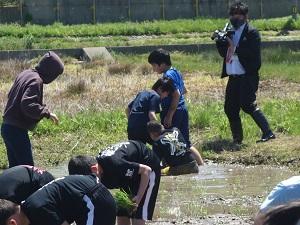 5年生は1年間かけて,米についての学習を行っていきます。米づくりの体験や米についての調査など様々なことを通して,米についての理解と関心を深めることがねらいです。今回は田植えを体験しました。ほぼ全員が初めての体験ということで,恐る恐る田んぼに入る子もいれば,しなやかに田植えを進める子,泥の感触を楽しむ子など,それぞれの楽しんでいた?ようでした。この後観察を続け,9月ごろに収穫の予定です。
