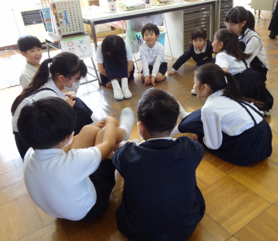 23日(火)に春のたてわりウォークラリーがありました。体育館での1年生を迎える会では,1年生が自己紹介をしたり,全校みんなでじゃんけん列車をしたりして楽しみました。その後は,校区ウォークラリーをしました。チェックポイントでは,班の友達と協力してゲームをしたりクイズに答えたりしました。ゴールの中央公園では,たてわり班でお弁当を食べました。班の友達と仲良く協力し,楽しい1日になりました。