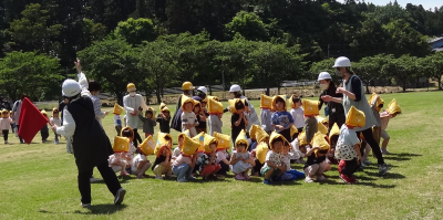 班のみんなでの遊びは、ハンカチ落とし、ドッジボール、伝言ゲームなどを楽しみました