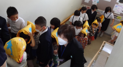 地震に伴う火災発生という想定のもと、非常ベルが鳴り、志雄小の子ども達と南部・中央保育所の園児が小学校の運動場に1次避難しました。そして、津波警報発令を受け、学校の2~3階へ2次避難する訓練となりました。
