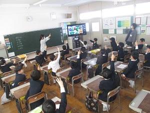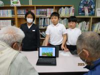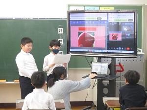 25日(木)の3・4限に町内の小学校3年生の総合的な学習の時間の合同発表会がありました。Meetを繋いで,これまでに学習してきたことを学校ごとに発表し合いました。志雄小学校は,金曽農園のりんごと志お食堂のオムライスについて発表しました。他の学校は,地区のししまいや紋平柿,アサギマダラなどについての発表をしており,子ども達は興味津々でした。一緒にクイズを楽しんだり感想を交流したりして,楽しく学びのある時間を過ごすことができました。