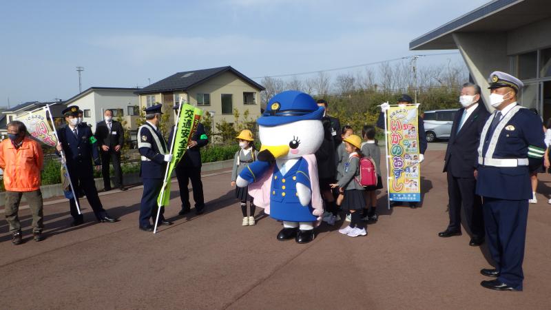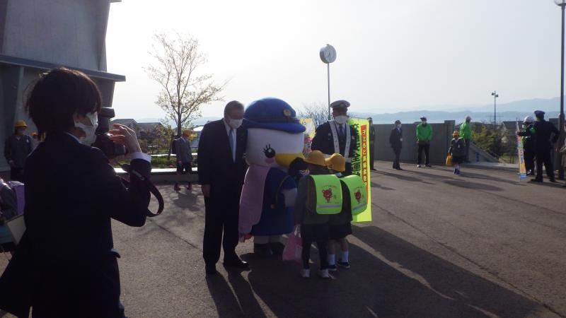 4月13日は、津端警察署の方々や地域の方々、マスコットキャラクター白鳥係長も子ども達を迎えてくれました。
