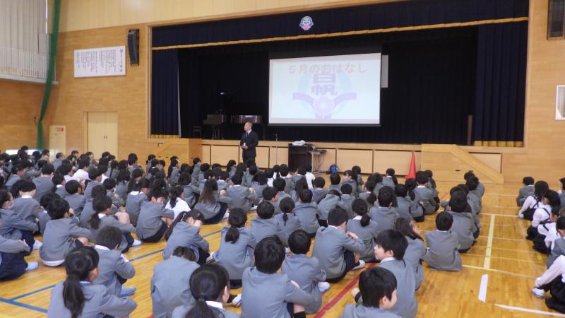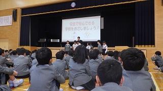 全校集会では、校長先生から1年間での成長について、三つの合言葉「自分から」「みんな一緒に」「最後まで」についてのお話を聞きました。