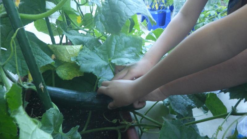 大きく立派なきゅうりに子供たちは大興奮でした。(大きすぎました・・・)
