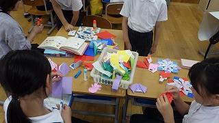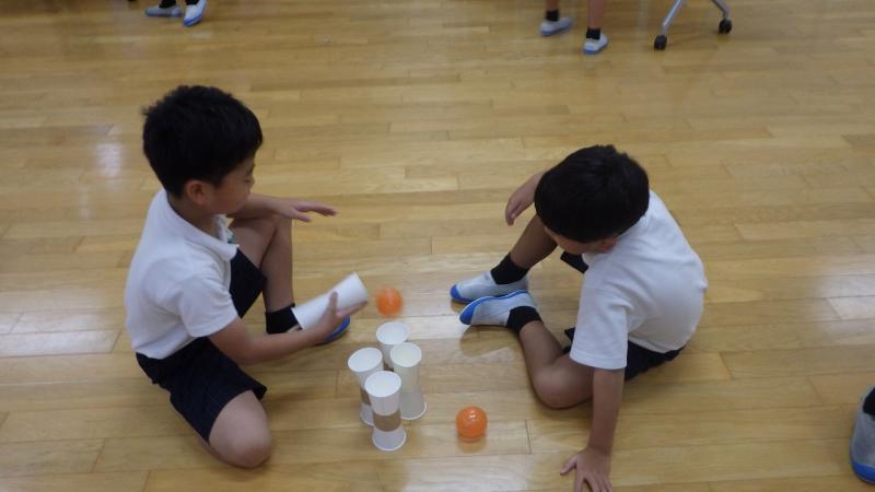 じゃんけん列車や転がしドッチボールをみんなで行い、2年生から1年生へ心を込めて作った折り紙のぴょんぴょんかえるをプレゼントしました。