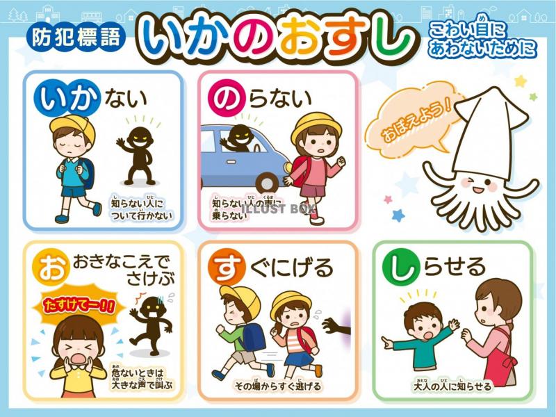 併せて、登下校時に不審者に遭遇した場合の正しい行動なども教えていただきました。合言葉は「いか、の、お、す、し」です。