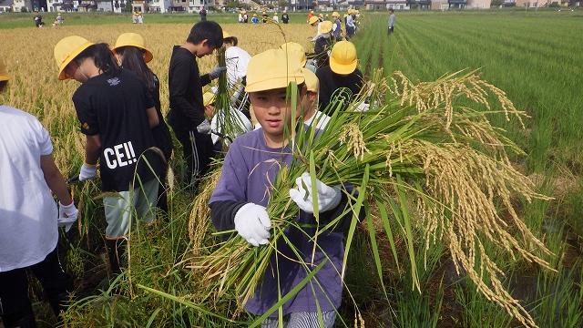 9月25日(月)に稲刈りを体験しました。実際に自分たちの手で稲を刈る体験を通して、手作業で作業をする大変さや、社会で学習した機械化による効率性も実感をもって理解することができました。