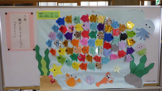 先日、折り紙で作っていただいたスイミーをPTAの方々が一枚一枚貼り付けて大きなスイミーにしてくれました。