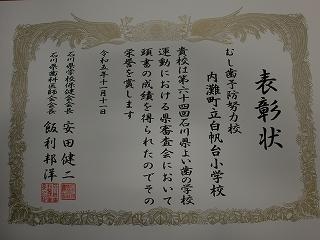 また、白帆台小学校が「第64回 よい歯の学校運動」で「むし歯予防努力校」に選ばれました。むし歯のない者、むし歯経験のある者、むし歯のある児童が治療した人数等から審査し、選ばれました。