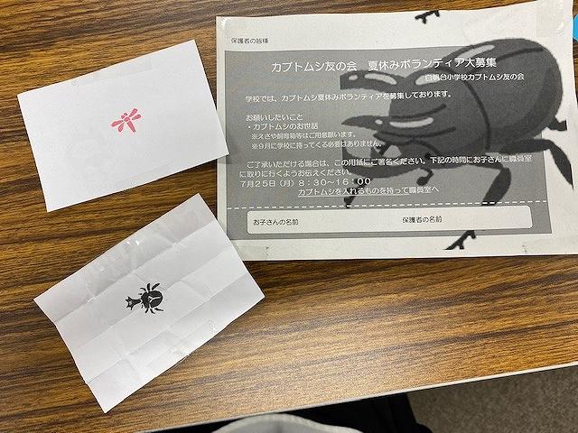 保護者の方の了承をいただけるならば、25日(月)に、この用紙とカブトムシを入れる箱を持って、学校にカブトムシを迎えにくることになっています。