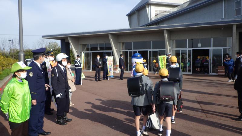 4月13日は、津端警察署の方々や地域の方々、マスコットキャラクター白鳥係長も子ども達を迎えてくれました。