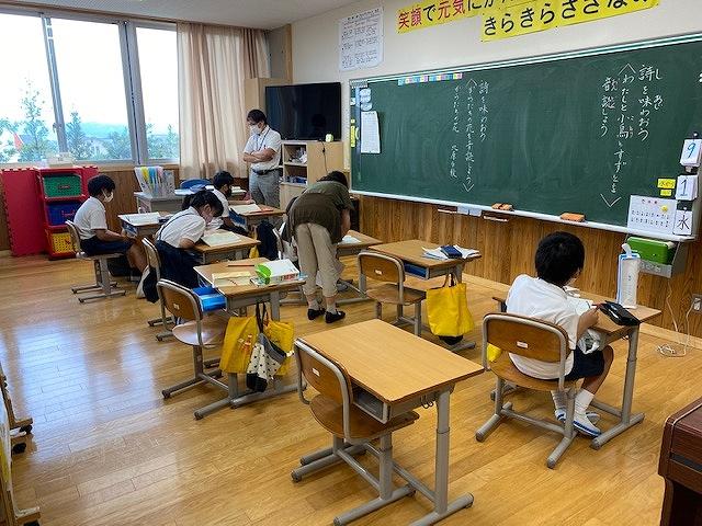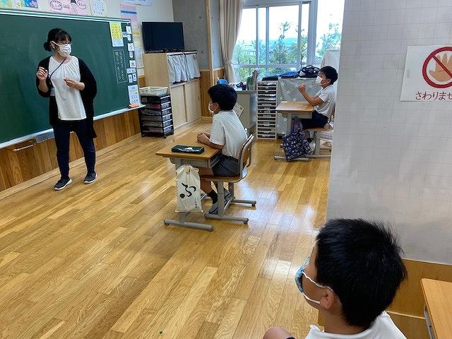 5時間目に歯の健康や歯磨きについてDVDを見ながら勉強しました。丁寧に歯磨きをしたつもりでも6割程度しか汚れがとれていないことや1mgの歯垢の中に細菌が2~3億個いるということを知り、子どもたちは驚いていました。また、コロナ禍ということで、実際に歯磨きはしませんでしたが、手などを歯ブラシに見立て、磨く真似をしながらコツを学びました。