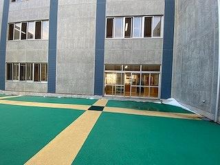 中学年が休み時間に2階から1階を眺めることのある、手すりがあります。この柵の隙間からあやまって物が落ちないように、防護ネットをつけました。