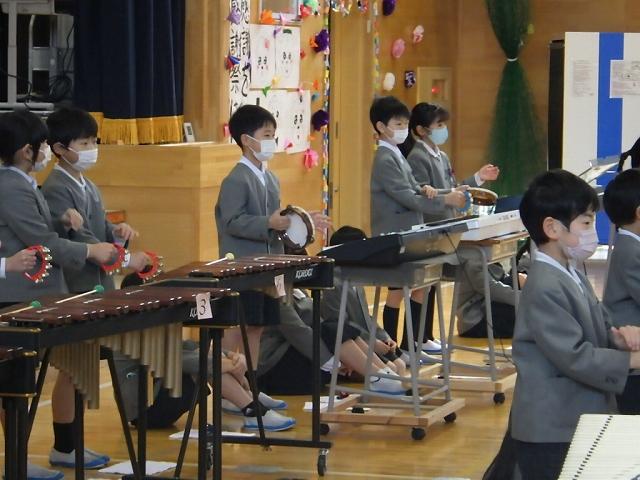 1~4年、6年生は体をゆらしたりリズムをとったりしながら、楽しいリズムや美しい歌声を味わっていました。