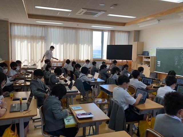 子どもたちは、クロムブックを用いて、外国の方が日本に来たくなるようなスライドを作り、それをもとに、英語で日本の四季や年中行事についてオンラインで1人1人発表することができました。