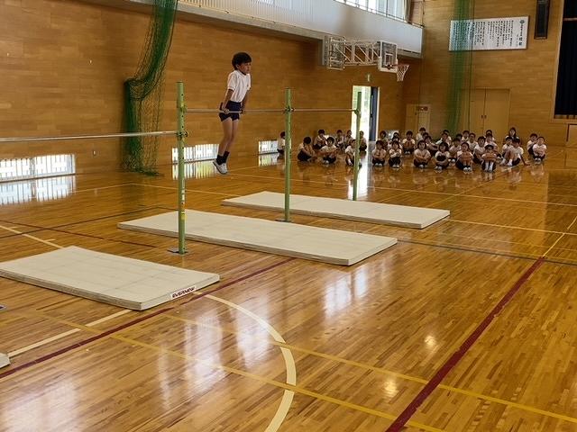 シンとした緊張感のある中で、子どもたちは、体育の授業で練習してきた、マット、鉄棒、跳び箱の技を披露しました。どの子たちも、練習の成果を発揮して、色々な技を披露しました。