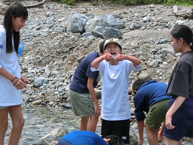 二日目は、イワナつかみを行いました。「命をいただく」ということに感謝し、一生懸命探して捕まえ、上手に捌いていました。