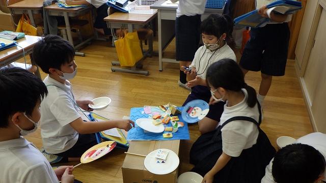 3年生の外国語活動 What do you like?「何がすき」では、自分の好きな色・食べ物・野菜・果物の言い方を学習しました。この学習の最後にお店屋さんで買い物をしようと学習のゴールを決めて、それぞれのお店屋さんを開き、自分の好きなものを集めて買い物をしました。英語でWhat color do you like?やWhat food do you like?などの英語表現を使って、上手に英語で会話をすることができました。買い物のカバンがいっぱいになったり、もっと買い物をしたいと3年生の子どもたちも楽しそうでした。