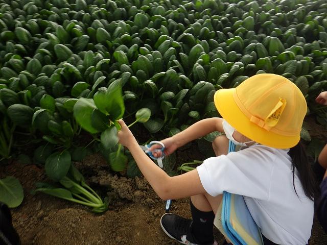 小松菜の摘み取りの体験もさせていただき、摘み取った小松菜をお土産にいただきました。嬉しそうに持ち帰った児童たちは、翌週の月曜日には、