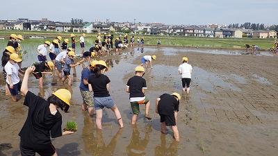 枠で印をつけたところに3本ずつ苗を植えていきます。初めは田んぼの泥に抵抗を感じて入れない児童もいましたが、最後には「もっとやりたい!」と夢中になって苗を植えていました。