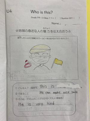 5年生「He can beke bread well.」では、canという表現を使いながら、地域のすてきな方をALTのローワン先生に紹介しました。